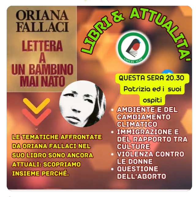 Nella rubrica di Patrizia nello spazio Twitter della nostra associazione viene presentato “Lettera ad un bambino mai nato” è un romanzo che parla di una donna che scrive lettere al figlio che non avrà mai, spiegandogli il mondo e la società in cui avrebbe dovuto vivere. Il romanzo è stato pubblicato nel 1975, ma molte delle tematiche che affronta sono ancora attuali. Nell’ascoltare il podcast scoprirete anche alcuni contributi audio della stessa Oriana Fallaci dell’epoca e stralci del libro letti da lei stessa. Nella serata abbiamo quindi condiviso riflessioni ed opinioni su: